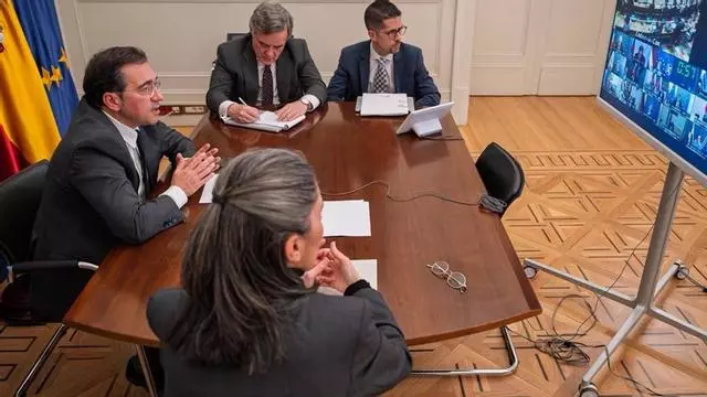 El ministre Albares, durant la reunió del gabinet de crisi en el Ministeri d’Exteriors, ahir. | EFE