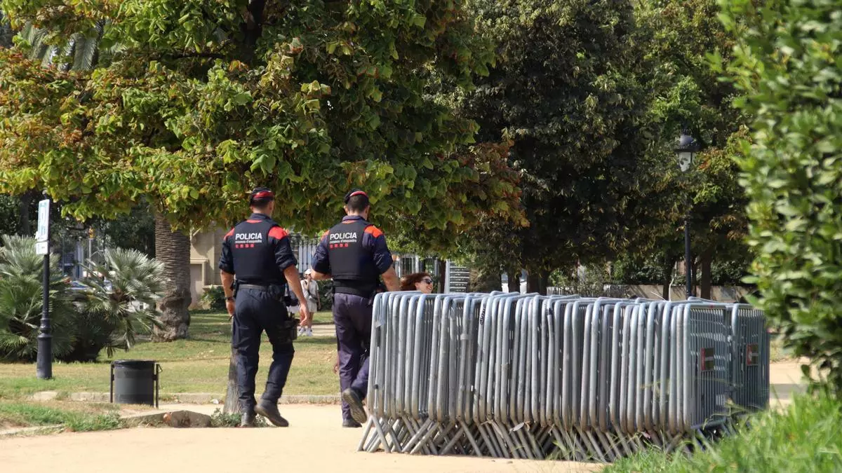 Dos agents dels Mossos caminen pel Parc de la Ciutadella i passen pel cantó de tanques metàl·liques. / Mariona Puig