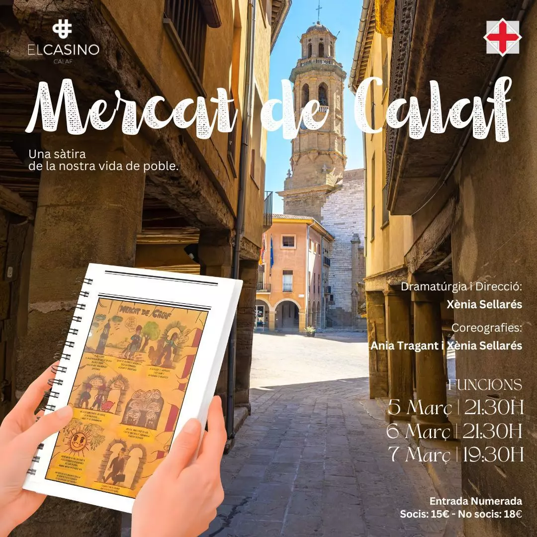 El Casino de Calaf estrena una proposta inèdita fins ara: una sàtira de poble amb un repartiment molt coral, que farà pujar 46 actors i ballarins a l’escenari en les tres úniques funcions programades el dijous 5, el divendres 6 i el dissabte 7 de març. Mercat de Calaf és una comèdia «amable» que parteix de la coneguda trobada veïnal dels dissabtes entre parades de fruita i roba. És un lloc on es parla de tot i les xafarderes inventen un rumor que fan córrer: l’Ajuntament ofereix una subvenció cultural molt substanciosa, però sempre que les dues entitats que hi ha al poble, el Casino i el Casal, presentin un projecte conjunt. I la trama ja està servida.