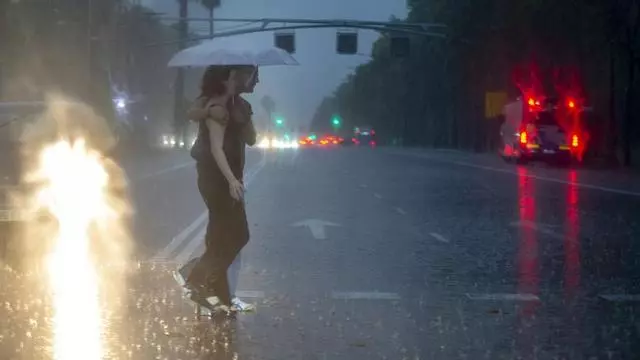 Una parella creua la Diagonal de Barcelona sota la pluja / JORDI COTRINA / EPC