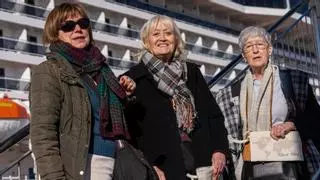 Mari Cruz Prieto, i Maria Cinta i Pilar López Samper, davant l’MSC Magnifica. | MANU MITRU